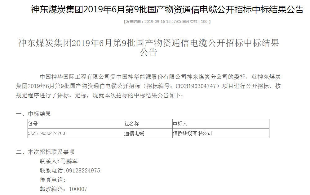 點擊數(shù):65432019-11-21 00:00:00 來源: 神東煤炭集團2019年6月第9批國產(chǎn)物資通信電纜公開招標中標結(jié)果公告